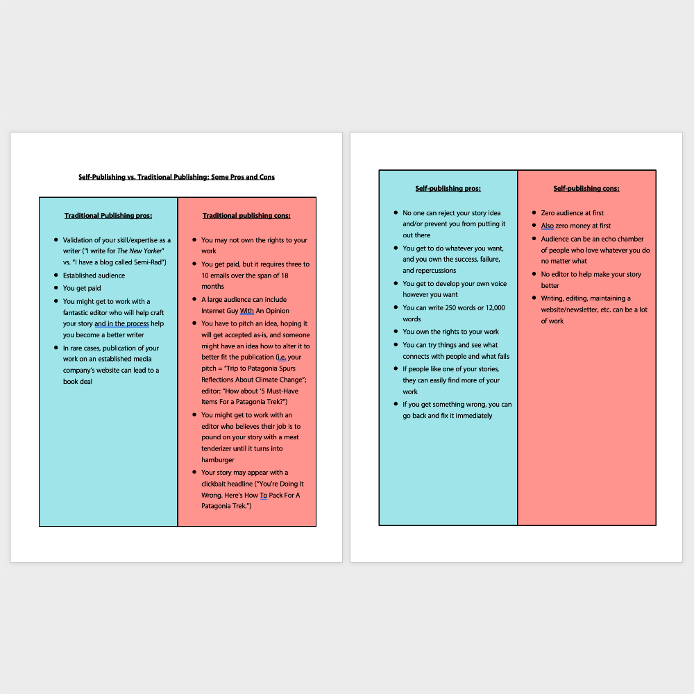 A 2-page PDF of some general advantages and disadvantages of self-publishing your own writing, and trying to get your writing published by someone else.